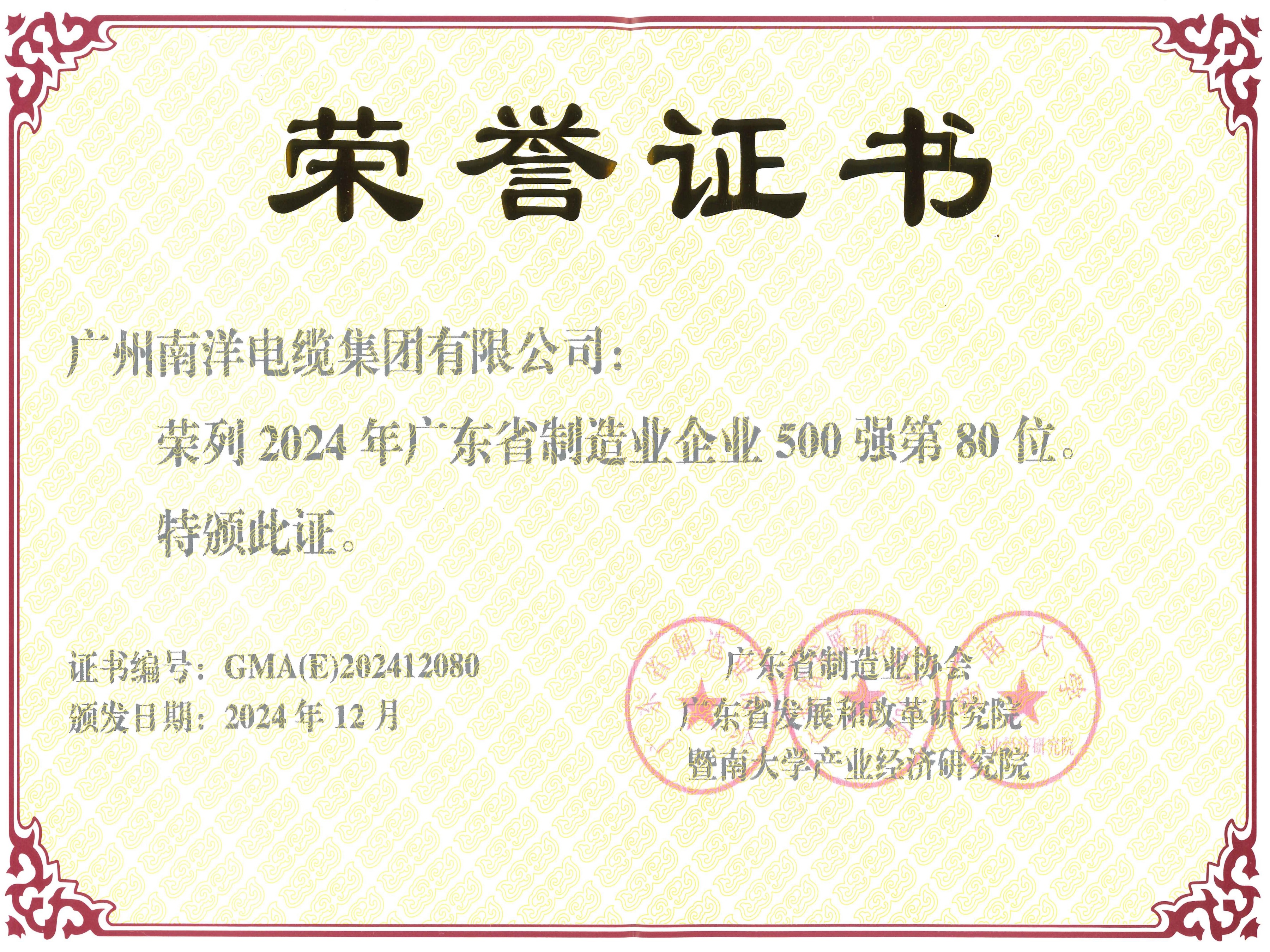 • 2024年廣東省制造業企業500強第80位證書